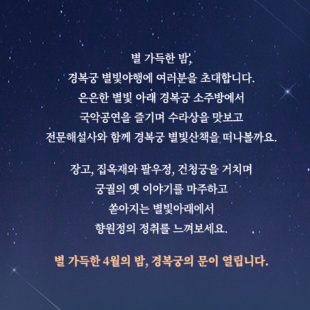문화재청 궁능유적본부는 한국문화재재단(이사장 최영창)과 함께 경복궁 소주방에서 조선시대 궁중의식을 체험하고 경복궁 야경을 탐방하는 「2024 경복궁 별빛야행」 상반기 행사를 오는 4월 3일부터 5월 4일까지 매주 수~일요일에 하루 두 차례씩 개최한다. ‘경복궁 별빛야행’은 궁궐의 부엌인 ‘소주방’에서 궁중음식을 체험하고 전문 해설사와 함께 경복궁 북측권역의 야경을 탐방하는 궁궐 문화 복합 체험 프로그램으로, 2016년 시작되어 관람객들에게 큰 사랑을 받고 있다.